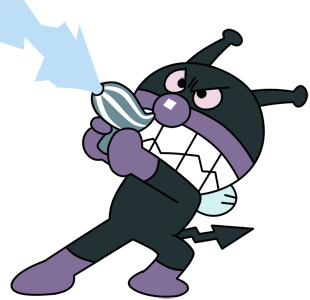 Baikinman is an anthropomorphic demonic germ who looks like a fly with large teeth, light pink eyes, purple lips, two antennas, fly-like wings, a purple nose, a zigzag-shaped tail, a black furry body, and a slimy blue tongue. When he is washed, his entire body is white (with the exception of eyes).