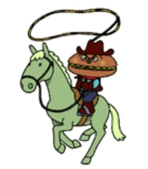 Hamburger-kid is a cowboy with a hamburger head voiced by Yuji Mitsuya who also voice Katsudonman. He wears stereotypical cowboy clothing and hat, utilizes a lasso, and rides a green horse named Pickles.
